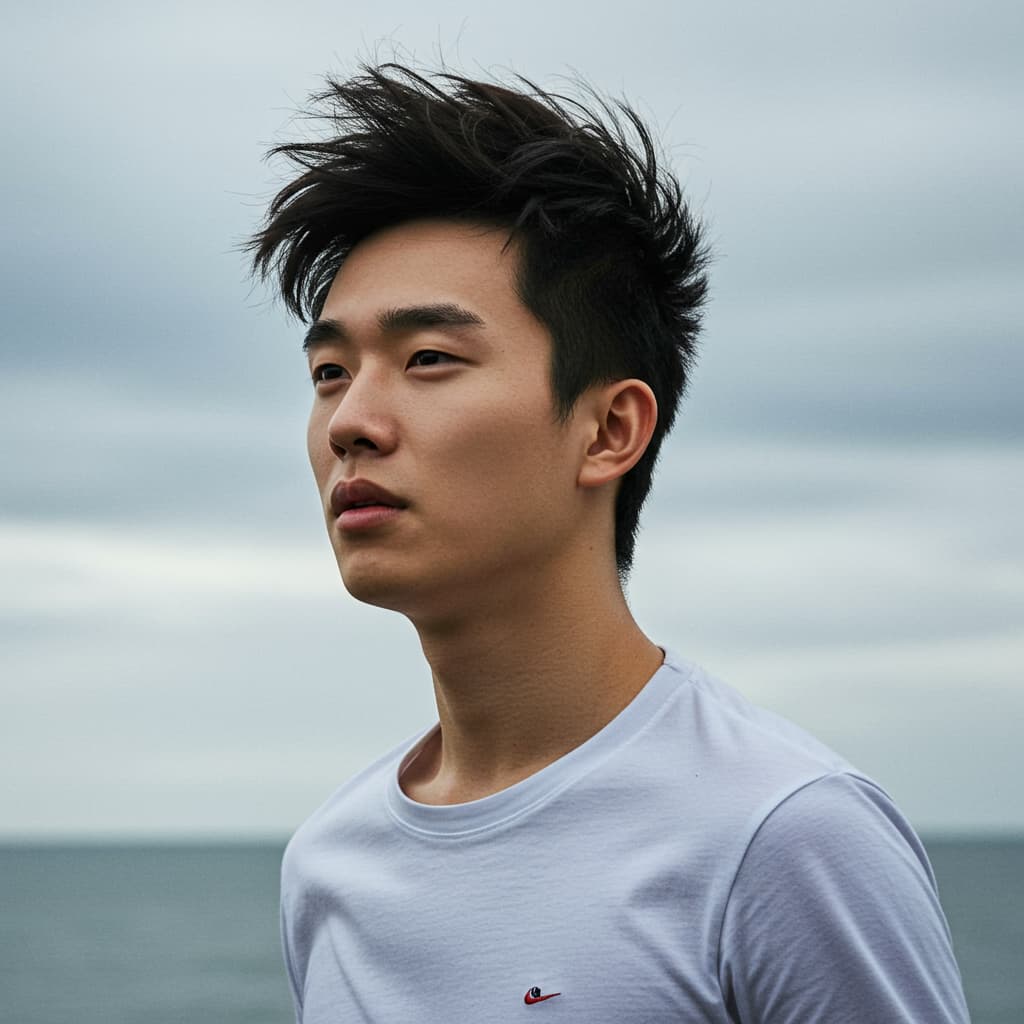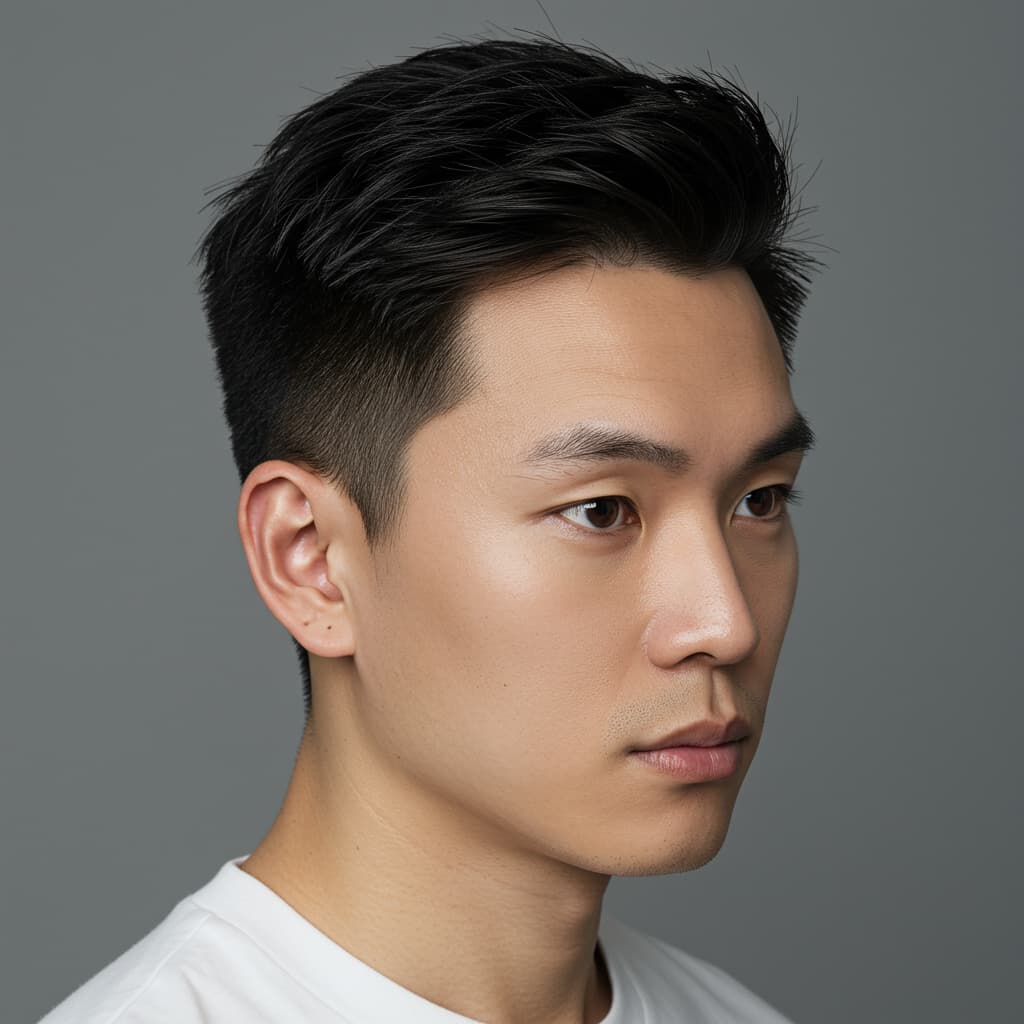 - Side profile: Reshaped hair whorl for a look that's 5 years younger.